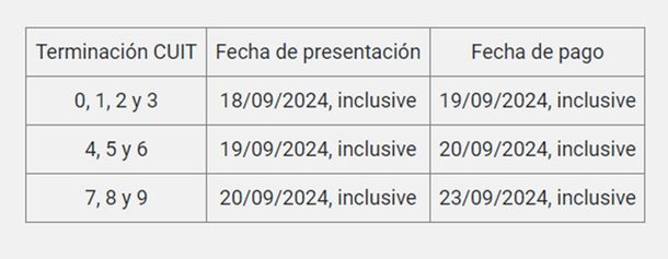 De esta manera, aquellos que cuenten con una terminación de CUIT que sea 0, 1, 2 y 3 podrán enviar sus declaraciones juradas hasta el 18 de septiembre, mientras que el pago podrá ser realizado hasta el 19 de septiembre inclusive.